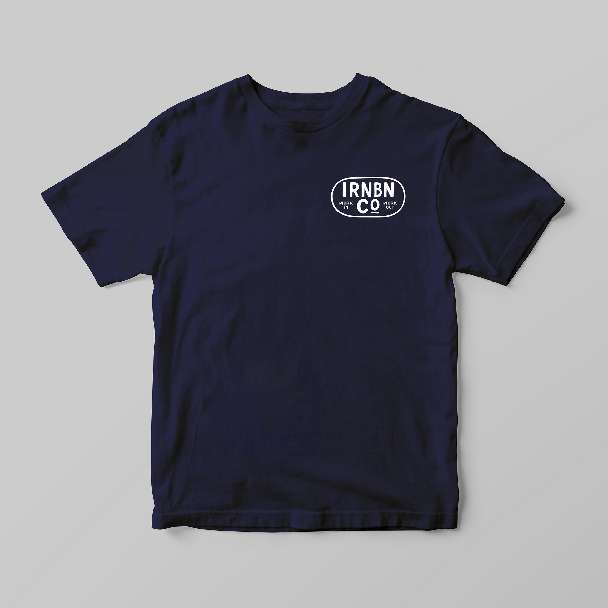 Finished in classic navy with bold Iron Bone Co. logo prints on the front and back, this tee embodies our motto — Work In. Work Out.