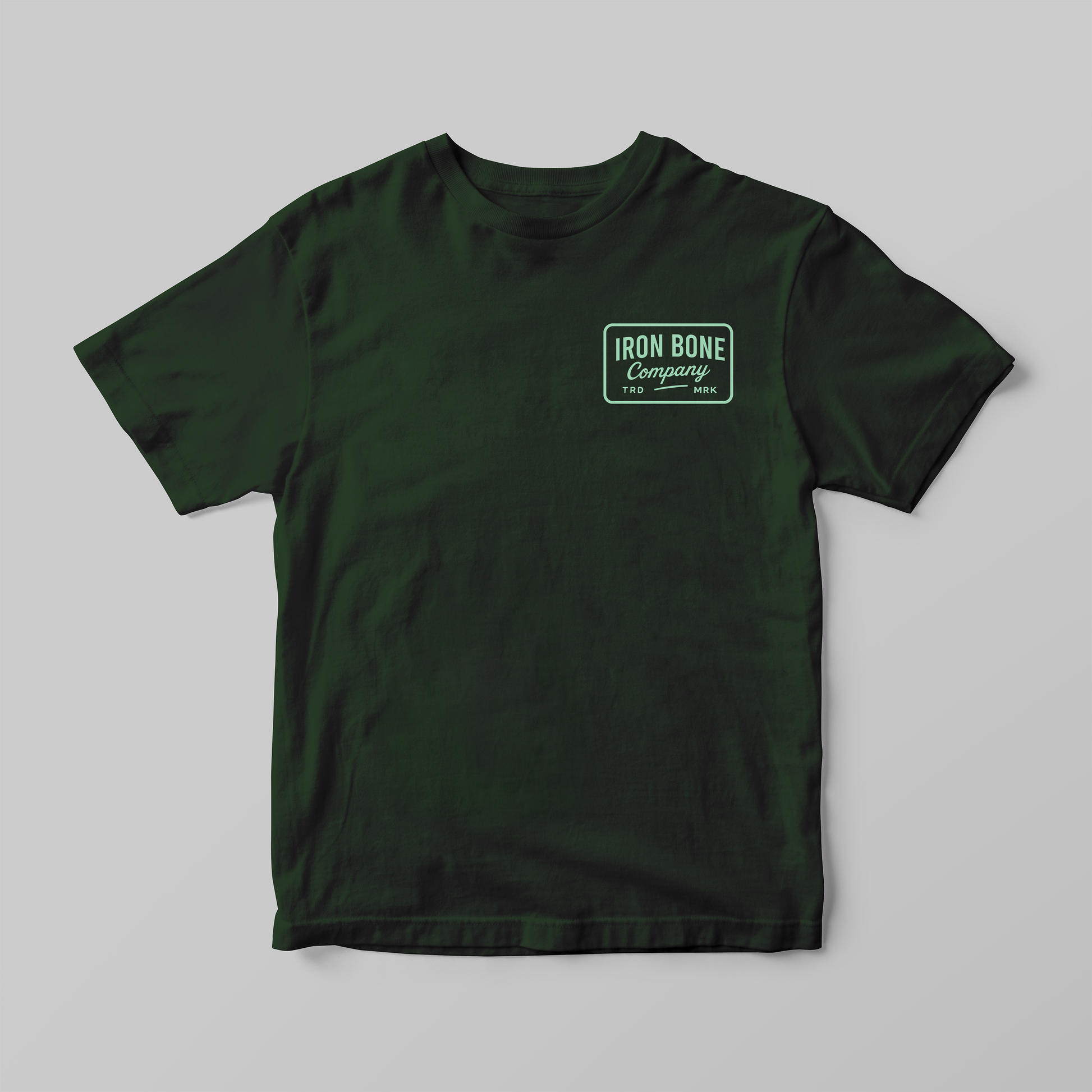 Finished in forest green with bold Iron Bone Co. logo prints on the front and back, this tee embodies our motto — Work In. Work Out.