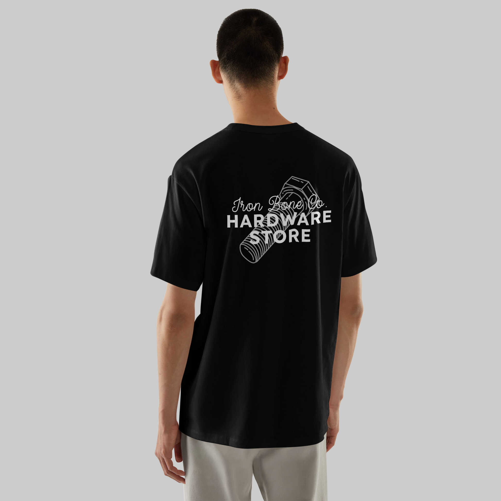 Finished in classic black with bold Iron Bone Co. logo prints on the front and back, this tee embodies our motto — Work In. Work Out.